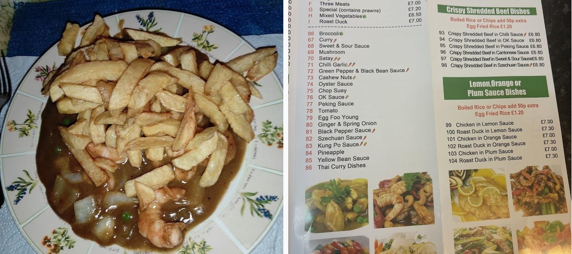 The menu features a wide variety of dishes including traditional fish and chips, fried rice, chow mein, soups, and many more. There's something for everyone.